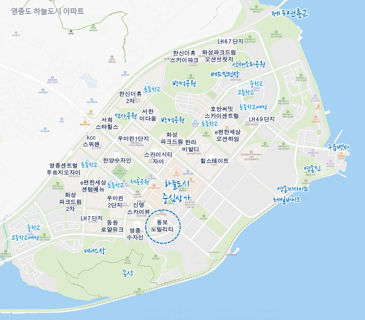 하늘도시 초기에 건축되어 14년 차 되었고, 하늘도시 끝부분에 있지만, 그래서 바다가 가깝고, 산이 단지 뒤에 있고, 앞으로 중심상가가 있어 생활하기 좋고, 운동이나 산책하기 좋은 아파트입니다.