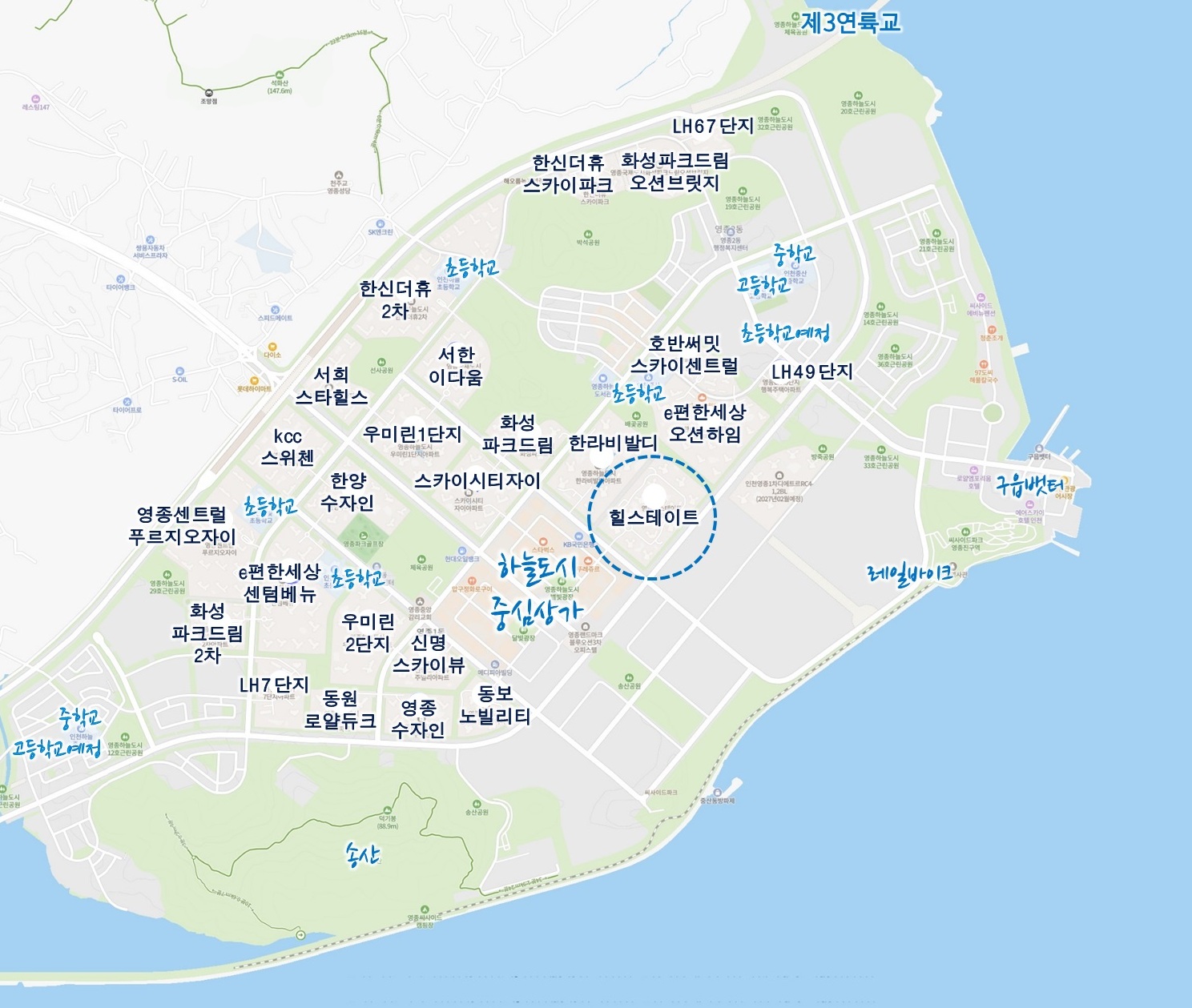 힐스테이는 단지 중심에서 직선거리로 인천중산초등학교까지 430m, 인천중산중학교까지 950m, 인천중산고등학교까지 850m입니다.