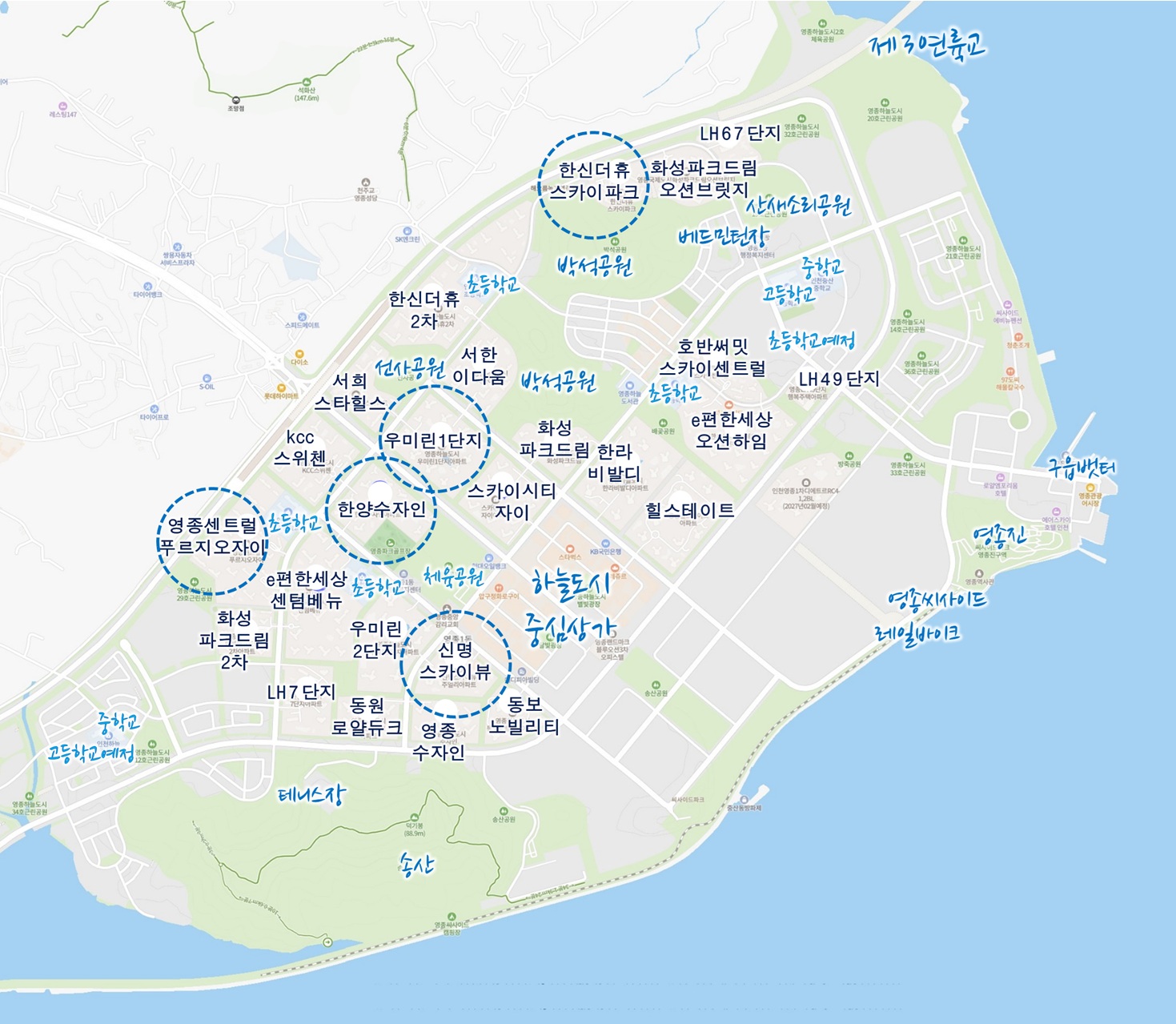 하늘도시는 단지 수가 많아 정보가 복잡하기 때문에, 실제 문의가 많은 한양수자인, 한신 더휴, 신명 스카이뷰, 우미린1단지, 센트럴푸르지오자이 5개 단지를 중심으로 소개합니다.